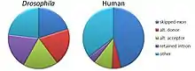 Research based on the Human Genome Project and other genome sequencing has shown that humans have only about 30% more genes than the roundworm Caenorhabditis elegans, and only about twice as many as the fly Drosophila melanogaster. This finding led to speculation that the perceived greater complexity of humans, or vertebrates generally, might be due to higher rates of alternative splicing in humans than are found in invertebrates.[49][50] However, a study on samples of 100,000 ESTs each from human, mouse, rat, cow, fly (D. melanogaster), worm (C. elegans), and the plant Arabidopsis thaliana found no large differences in frequency of alternatively spliced genes among humans and any of the other animals tested.[51] Another study, however, proposed that these results were an artifact of the different numbers of ESTs available for the various organisms. When they compared alternative splicing frequencies in random subsets of genes from each organism, the authors concluded that vertebrates do have higher rates of alternative splicing than invertebrates.[52]