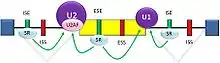 HIV, the retrovirus that causes AIDS in humans, produces a single primary RNA transcript, which is alternatively spliced in multiple ways to produce over 40 different mRNAs.[43] Equilibrium among differentially spliced transcripts provides multiple mRNAs encoding different products that are required for viral multiplication.[44] One of the differentially spliced transcripts contains the tat gene, in which exon 2 is a cassette exon that may be skipped or included. The inclusion of tat exon 2 in the RNA is regulated by competition between the splicing repressor hnRNP A1 and the SR protein SC35. Within exon 2 an exonic splicing silencer sequence (ESS) and an exonic splicing enhancer sequence (ESE) overlap. If A1 repressor protein binds to the ESS, it initiates cooperative binding of multiple A1 molecules, extending into the 5’ donor site upstream of exon 2 and preventing the binding of the core splicing factor U2AF35 to the polypyrimidine tract. If SC35 binds to the ESE, it prevents A1 binding and maintains the 5’ donor site in an accessible state for assembly of the spliceosome. Competition between the activator and repressor ensures that both mRNA types (with and without exon 2) are produced.[43]