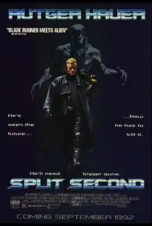 Split Second is a 1992 science fiction action horror film directed by Tony Maylam and Ian Sharp,[5] and written by Gary Scott Thompson. A co-production between the United States and the United Kingdom, the films stars Rutger Hauer as a burnt-out police detective obsessively hunting down the mysterious serial killer who killed his partner several years prior. The film also features Kim Cattrall, Alastair Neil Duncan, Pete Postlethwaite, Ian Dury, and Alun Armstrong.
