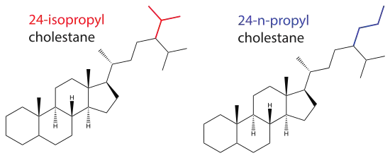 While marine pelagophyte algae predominantly produce 24-n-propylcholestane,[8] they also produce 24-isopropyl cholestane. The two possible sources of 24-isopropyl cholestane to rocks, the demosponge and the algae, can be decoupled by considering the ratio of 24-isopropyl cholestane to 24-n-propyl cholestane. In many rocks, this ratio is 0.2-0.3.[3] However, in rocks from Oman, the ratio of steranes is 0.52-16.1, with an average value of 1.51, which strongly suggests input of sponge organic matter.[3] Notably, these elevated values disappear during the Cambrian, and the ratio of 24-isopropyl cholestane to 24-n-propyl cholestane is used an age-specific proxy for the Proterozoic-Phanerozoic transition.[9]