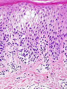 Spongiosis is mainly intercellular[1] edema (abnormal accumulation of fluid) in the epidermis,[2] and is characteristic of eczematous dermatitis, manifested clinically by intraepidermal vesicles (fluid-containing spaces), "juicy" papules, and/or lichenification.[3] It is a severe case of eczema that affects the epidermis, dermis and/or subcutaneous skin tissues.[4][5] The three types of spongiotic dermatitis are acute, subacute and chronic.[5] A dermatologist can diagnose acute spongiotic dermatitis by examining the skin during an office visit but a biopsy is needed for an accurate diagnosis of the type.[6]