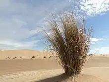 This species forms dense clumps of sharp-tipped leaves.[3] The stems may grow up to 2 meters tall. The inflorescence is a cylindrical panicle up to 70 centimeters long. It has many branches each a few centimetres long which grow pressed to the stem. They contain spikelets each up to a centimeter in length.[2]