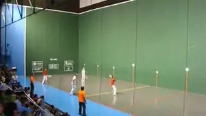 Pelota purépecha has the Purépecha language, and is an Indigenous Mexican sport. A common variant, distinguished as pasárutakua in Purépecha, uses a ball which has been set on fire and can be played at night.[6][7] It has a league,[8] several practicing communities[6] and about 800 players across Mexico as of 2010.[9] It is one of 150 pre-Hispanic Mexican games at risk of dying out along with Ulama.[9]
