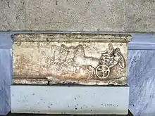 The prominence of athletic subject material in Greek art is no coincidence. Even statuary, called Athletic Dedications, arose as a way to immortalize Greek athletes and athletic games. Athletic events and art were so closely related that a common practice of athletes was to commemorate their victories with artistic dedications. One example of this would be the marble Apobates Base which commemorates victory in a chariot race at the Panathenaic Games. A competitor would erect a dedication to celebrate an athletic victory and place it in a sanctuary or Panhellenic site. These dedications were an artistic celebration of athletic prowess which every Greek could observe.[11]