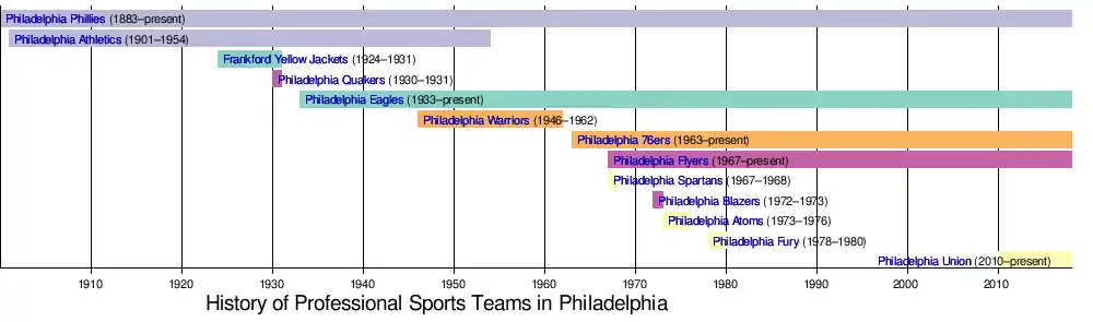 The timeline includes Philadelphia franchises that played in major professional sports leagues after 1900. Note that the Philadelphia Field Club was actually four different franchises.