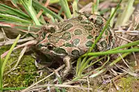 The spotted grass frog or spotted marsh frog (Limnodynastes tasmaniensis) is a terrestrial frog native to Australia. It is distributed throughout all of New South Wales and Victoria, eastern South Australia, the majority of Queensland, and eastern Tasmania. It is also naturalised in Western Australia, having been unintentionally introduced at Kununurra in the 1970s, apparently during the relocation of several hundred transportable homes from Adelaide.[2]