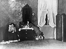 Camilla Eibenschütz played Wendla in the 1906 Berlin production.[7] It was first staged in English in 1917 in New York City. This performance was threatened with closure when the city's Commissioner of Licenses claimed that the play was pornographic, but a New York trial court issued an injunction to allow the production to proceed.[8] One matinee performance was allowed for a limited audience.[9] The New York Times deemed it a "tasteless production of a badly translated version [of] the first and most celebrated play by the brilliant Frank Wedekind." The production at the 39th Street Theatre starred Sidney Carlyle, Fania Marinoff and Geoffrey C. Stein.[10] Drama critic Heywood Broun panned the production but singled out Stein as giving "the worst performance we have ever seen on any stage."[11]
