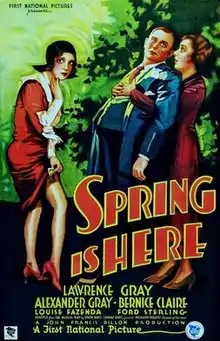 Spring Is Here is a 1930 American Pre-Code musical comedy film produced by First National Pictures and distributed by Warner Bros. It was adapted by James A. Starr from the 1929 musical play, of the same name, by Owen Davis, with music by Richard Rodgers and Lorenz Hart.[1] The film stars Lawrence Gray, Alexander Gray, and Bernice Claire.