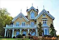 Spring Side is a historic residence located just outside of Bellevue, Iowa, United States. The house was influenced by the Gothic Revival "cottage" popularized by A.J. Davis and A.J. Downing.[2] It is sited on a hillside overlooking a valley and the Mississippi River. The property is the source for three springs, hence its name from 1867. Constructed in 1848 for William T. Wynkoop, a local businessman, the 2½-story stone building features steeply pitched gables trimmed with wooden scroll-work vergeboard and pendants with finials, and a gabled tower with the same decorative elements and lancet arch windows. Native limestone is its primary construction material. The house originally had a wraparound porch that was removed. It was listed on the National Register of Historic Places in 1990.[1]
