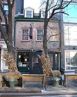 - James Brown House, 326 Spring Street, an historic building completed in 1817, and a New York City landmark, listed as well on the National Register of Historic Places.[46] It is one of the few existing examples of Federal architecture in the neighborhood.[12] The New York City Landmarks Preservation Commission called it "a modest survivor of one of those charming, comfortable, small early nineteenth century houses, once abundant in [New York] City."[46] On the building's ground floor is The Ear Inn, one of the oldest taverns in New York City.[12]