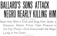 On Saturday, July 5, 1908, at approximately 12:45 a.m., shortly after the saloons closed for the night, an intruder allegedly entered the home of a 45-year-old white hoisting engineer at a mine, Clergy "Posey" Ballard, located at 1135 North Ninth Street.[103] Ballard was a long-time resident, and one of the "best beloved men" of the North End – a primarily white, mixed-income neighborhood.[109] He had worked on the Chicago, Peoria and St. Louis railroad for 16 years, has been employed at the Jones & Allen mine for the last two years, and was well-liked among the mining community.[110]