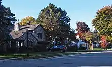 Each individual house is unique, but all of the houses and duplexes are one, one-and-a-half, or two stories tall. All have Colonial Revival details and gable roofs. Exterior materials include brick, stone, clapboard, and combinations thereof. Most garages are attached, except in the northern sections of the neighborhood. The single-family house types include one-and-a-half-story Cape Cods, two-story center entrance, one-and-half-story cottages, and one-story ranch houses.[2]