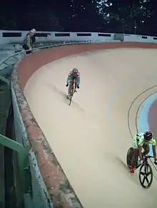 The men's team sprint (also known as the Olympic sprint) is a short distance three-man team pursuit held over three laps of a velodrome. Like the (much longer) team pursuit event, two teams race against each other, starting on opposite sides of the track, but at the end of the first lap, the leading rider in each team drops out of the race by riding up the banking leaving the second rider to lead for the second lap; at the end of the second lap, the second rider does the same, leaving the third rider to complete the last lap on his own. In the women's event, teams of two compete over a two-lap distance. The team sprint has been an Olympic event for men since 2000 and for women since 2012.