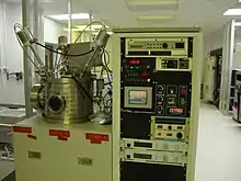 In physics, sputtering is a phenomenon in which microscopic particles of a solid material are ejected from its surface, after the material is itself bombarded by energetic particles of a plasma or gas.[1] It occurs naturally in outer space, and can be an unwelcome source of wear in precision components. However, the fact that it can be made to act on extremely fine layers of material is utilised in science and industry—there, it is used to perform precise etching, carry out analytical techniques, and deposit thin film layers in the manufacture of optical coatings, semiconductor devices and nanotechnology products. It is a physical vapor deposition technique.[2]