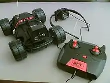 The Spy Video Car is a hybrid product created by mixing a traditional RC car and a video baby monitor. The remote controller communicates digital command via the 49 MHz frequency to the car for control, and the camera on the car transmits video via the 2.4 GHz frequency to the remote controller for display. Because both directions use different radio frequency, they do not interfere with each other. The single-lensed display with a zoom lens produces a bigger virtual image in front of the operator, creating a first-person point of view feel for the driver.