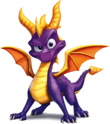 Spyro is an energetic, young, male, purple dragon. He is known for his ability to defeat enemies by breathing fire and charging at them, and his ability to glide to otherwise unreachable areas in the game world. Spyro is often accompanied by his best friend Sparx, who is a dragonfly.