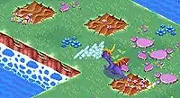 Sparx, the dragonfly that follows Spyro, acts as Spyro's health meter. Spyro begins the game with four hit points and four lives. Spyro can be harmed four times before he loses a life. Each time Spyro loses a hit point, Sparx changes color accordingly. When Spyro loses three of his four hit points, Sparx disappears.[7] Spyro can restore hit points by feeding Sparx butterflies, which can be obtained by killing small animals such as rabbits and sheep. Occasionally, a special butterfly can be found that can give Spyro an extra life.[8] Sparx can also give advice on how to accomplish particular challenges and hints on how to perform certain tasks. The ability to receive advice from Sparx can be toggled on and off from the pause menu.[6]