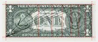 On the reverse of the current US one-dollar bill, the "large inner box" has a length-to-width ratio of the square root of 7, and a diagonal of 6.0 inches, to within measurement accuracy.[15]