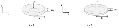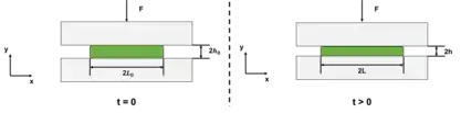 Where is the initial height of the droplet, is the final height of the droplet, is the applied squeezing force, is the squeezing time, is the fluid viscosity, is the width of the assumed rectangular plate, and is the initial length of the droplet.[2]