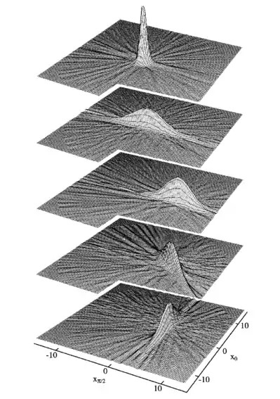 As can be seen in the illustrations, in contrast to a coherent state, the quantum noise for a squeezed state is no longer independent of the phase of the light wave. A characteristic broadening and narrowing of the noise during one oscillation period can be observed. The probability distribution of a squeezed state is defined as the norm squared of the wave function mentioned in the last paragraph. It corresponds to the square of the electric (and magnetic) field strength of a classical light wave. The moving wave packets display an oscillatory motion combined with the widening and narrowing of their distribution: the "breathing" of the wave packet. For an amplitude-squeezed state, the most narrow distribution of the wave packet is reached at the field maximum, resulting in an amplitude that is defined more precisely than the one of a coherent state. For a phase-squeezed state, the most narrow distribution is reached at field zero, resulting in an average phase value that is better defined than the one of a coherent state.