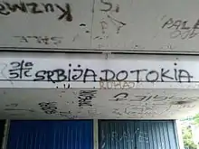 Graffiti containing the message are present in Serbia, as well in Republika Srpska and other parts of Bosnia and Herzegovina.[1][2][3] Such graffiti was also seen in Kosovo during the Kosovo War.[4] In the Kosovo village of Lozica in the Mališevo municipality, the local Albanian population was claiming that the graffiti "Srbija do Tokija" was written by Serbian military forces during the destruction of the village.[5]