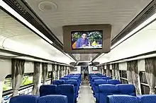 •AC chair car provided with 180° Rotatable seats which consists of mobile charging sockets and audio visual system for infotainment.