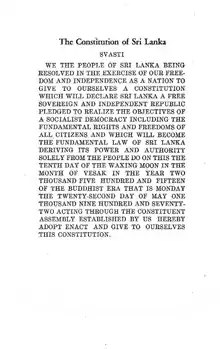 The Sri Lankan Constitution of 1972 was a constitution of Sri Lanka, replaced by the 1978 constitution currently in force. It was Sri Lanka's first republican constitution, and its second since independence in 1948. The constitution changed the country's name from Ceylon to Sri Lanka, and established it as an independent republic.[1][2][3][4][5] The country was officially designated "Republic of Sri Lanka," leading to this constitution being known as "the 1972 Republican Constitution." The constitution was promulgated on 22 May 1972.[1]