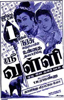 After the success of Amara Deepam (1956), director T. Prakash Rao and co-writer C. V. Sridhar wanted their next film to be on a grander scale. Rao decided on the folk tale of Valli, and he and Sridhar approached Sivaji Ganesan to star. Ganesan refused, saying another producer was adapting the story (as Sri Valli) and paid him an advance to star in it.[3] The film was directed by T. R. Ramanna, while Thanjai N. Ramaiah Dass wrote the screenplay.[4] Actor Vijayakumar made his debut through the film playing the younger role of Muruga,[5][6] and Lakshmi too made her debut through the film playing the younger role of Valli.[7] T. R. Mahalingam, who portrayed Muruga in the 1945 film version of Sri Valli, portrayed Narada in this film. This was the first Tamil film based on Valli to be in colour as the previous ones were in black-and-white.[4] The film was colourised using Gevacolor.[2]