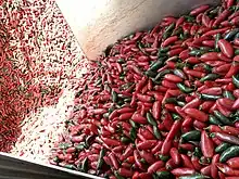 The production of sriracha sauce begins with growing the chilis. The chilis were grown on Underwood Ranch until the two companies ended their relationship in 2016.[21] David Tran, owner of Huy Fong Foods, contracted about 690 hectares (1,700 acres) of farmland that spreads from Ventura County to Kern County in California.[22] In order to make sriracha, the chili peppers are planted in March.[23]