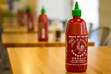 The basic ingredients of red chilies, garlic, and vinegar have not changed since the early days of the product.[11] Today, the bottle lists the ingredients as: "chili, sugar, salt, garlic, distilled vinegar, potassium sorbate, sodium bisulfite and xanthan gum". Huy Fong Foods' chili sauces are made from fresh, red, jalapeño chili peppers and contain no added water or artificial colors.[18] Garlic powder is used rather than fresh garlic.[19] The company formerly used serrano peppers, but found them difficult to harvest. To keep the sauce hot, the company produces only up to a monthly pre-sold quota in order to use only peppers from known sources.[5] The sauce is certified as kosher by the Rabbinical Council of California.[20] Huy Fong Foods' sriracha sauce ranks in the 1,000–2,500 heat units range, above banana pepper and below Jalapeño pepper, on the Scoville scale used to measure the spicy heat of a chili pepper.[1]