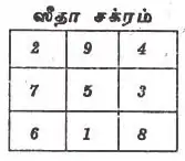 There is another smaller mystic diagram, called Seetha Chakra given in Tamil almanacs. In some almanacs[1][2] it is given as a magic square of order 3 whereas in some others[8] it is an arrangement of 9 small squares in 3 rows and 3 columns in which the digits 1, 2, .. 9 are written in that order column-wise from left to right.