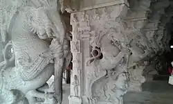 The Vijayanagar and Nayak kings commissioned paintings on the walls of the shrine of temple, some of which are still present.[5] Thiruvengadamudayan hall, located to the right of the gopuram, houses rare life size sculptures commissioned during the 16th century. It was built by Vadamalayappa Pillai, an official in the Madurai Nayak kingdom. There are numerous images of yalis, elephants and deities in the hall, some of which are even 5 ft (1.5 m) wide. The major images seen in the temple are that of Bhikshatana, Venugopala, Krishna as Madanagopala, Krishna as Govardhanagiri, Nammalvar, Kamadeva (Manmatha) and Rati. Depiction of Hanuman in various poses can be seen in the temple. There are life size images of Agora Virabhadra and warriors. Rama is seen hugging the monkey king Sugreeva with his right hand and holding his bow in the left and on his left stands Sita, while in another pillar he is seen hugging Hanuman with his right hand and Angada seen standing in anjali. A host of monkey warriors standing at the bottom of both the sculptures.[3] The composite columns of Virabhadra holding sword and horn are found be additions of the Vijayanayagara kings during the early 1500s.[6]