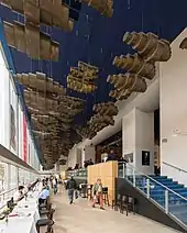 The new house was decorated by a large painting commissioned from Marc Chagall in 1959, Commedia dell’Arte.[5] The ceiling of the foyer which is common for play and opera is decorated with a sculpture by Zoltán Kemény, Goldwolken (Golden Clouds).[6] The house was opened in December 1963.[6]