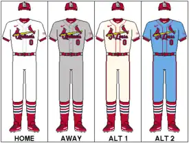 On November 16, 2012, the Cardinals unveiled a new alternate uniform to be worn at home games on Saturdays beginning with the 2013 season. The modified jersey, cream-colored with red trim on the sleeves and down the front, retains the "birds on the bat" but is the first since 1932 in which "St. Louis" is used instead of "Cardinals".[128] 2013 also saw the team adopt their red caps as their main cap for both home and away games for the first time since 1991; the navy cap was retained as an alternate, used when visiting other teams with red home caps.[127]