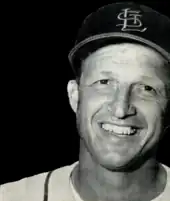 In the 1940s, a golden era emerged as Rickey's farm system became laden with such talent as Marty Marion,[43] Enos Slaughter,[44] Mort Cooper,[45] Walker Cooper,[46] Stan Musial,[47] Max Lanier,[48] Whitey Kurowski,[49] Red Schoendienst[50] and Johnny Beazley.[51] It was one of the most successful decades in franchise history with 960 wins and 580 losses for a winning percentage higher than any other Major League team at .623.[52] With Billy Southworth managing, they won the World Series in 1942 and 1944 (in the only all-St. Louis series against the Browns), and won 105 or more games each in 1942, 1943, and 1944.[7] Southworth's managerial winning percentage (.642) is St. Louis' highest since the franchise joined the National League.[53][54] Musial was considered the most consistent hitter of his era and most accomplished in team history, winning three MVPs and seven batting titles.[47][55] St. Louis then won the 1946 World Series on Slaughter's Mad Dash in Game 7.[56] Breadon was forced to sell the team in 1947 but won six World Series and nine NL pennants as Cardinals owner.[22] They remained competitive, finishing .500 or better in thirteen of the next seventeen seasons, but fell short of winning the league or World Series until 1964.[7]