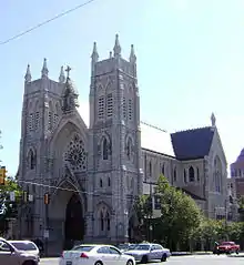 St. Agatha–St. James Church (formerly St. James Church) is a Roman Catholic church in Philadelphia, Pennsylvania, established in 1850. As the first Roman Catholic parish in Philadelphia west of the Schuylkil River, St. Agatha-St. James Church is the mother church of West Philadelphia. Originally, a small church dedicated to St James the Greater was constructed in an open field at 38th and Chestnut Streets (then known as Mary and James Streets), but with the rapid influx of Catholics into the area, particularly from Ireland, the decision was made to build a larger church on the same land. Construction of the current building, designed by Philadelphia architect Edwin Forrest Durang, began on October 16, 1881 and was completed on the same day in 1887. The hand-carved wooden confessionals from the original 1850 church were placed in the new building and remain to this day.