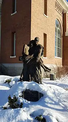 A bronze statue of St. Aloysius outside the church, created by Anita Pauwels, depicts him carrying a victim of the plague.[8]