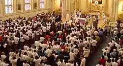 The New York Times reported that President James Buchanan and several Cabinet members were present for the dedication of the church on October 16, 1859.[3] Jesuit Father Benedict Sestini, a Mathematics teacher at Georgetown University, served as the church's architect. The painting above the main altar, showing Aloysius Gonzaga receiving his first Holy Communion from the hands of Cardinal (St.) Charles Borromeo, was the work of the noted Constantino Brumidi, who is famous for painting the frescoes in the rotunda of the United States Capitol.