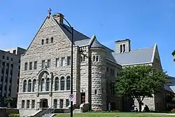 The Rev. John F. Brazill became the pastor in 1861, and he built a school in 1863. The Sisters of Charity of the Blessed Virgin Mary came to Des Moines to teach in the school. By 1865 a larger stone church building was constructed. The Gothic Revival structure featured two towers that flanked the main facade. Brazill was an influential person in the Church and in the society at large.[7] Bishop Clement Smyth, OCSO named him the vicar general of the diocese, and he cultivated many contacts in state government. He acquired a great deal of real estate for himself and the Church that amounted to $250,000 at the time of his death in 1885.[7] One of the parcels of land he owned at Sixth and High Streets became the site of a new St. Ambrose church in the 1890s.