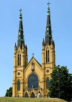 St. Andrew's Catholic Church is a historic Roman Catholic church and rectory in Roanoke, Virginia, United States. It was built in 1900-1902, and is a buff brick church on a stone foundation in the High Victorian Gothic style. It has a cruciform plan and features two tall Gothic towers which flank the main entrance and are square in plan. On each tower are two small lancet windows, two large pointed-arch stained-glass tracery windows, and sets of double pointed-arch openings at the belfry. Also on the property is a rectory built in 1887. The church replaced an earlier small brick church built in 1883.[3]