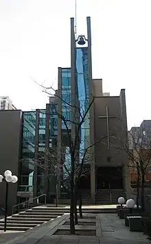 The existing church at 117 Bloor Street East is a separate building facing Bloor St. and is set back into the urban courtyard, St. Andrew's Square. It is adjacent to the office tower, 121 Bloor St. East. A portion of the old church was retained by the city of Toronto and is now located further south on Yonge Street marking the entrance to McGill Street. Several other United Churches chose the same path in this period such as College Street United Church and Parkdale United Church.