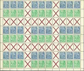 The St. Andrew's crosses were again used for a short time during the 1917 issue of special handling stamps that consisted of 13 rows and eight columns, so that 104 special handling stamps were on a pane. The middle four stamps in the bottom row were replaced by St. Andrew's crosses. The issue and printing of these sheets with St. Andrew's crosses was not originally planned but because of the public disapproval of the triangular predecessor, it was decided to change to horizontal format for this stamp issue.
