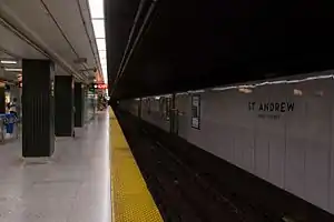 St. Andrew is a subway station on Line 1 Yonge–University in Toronto, Ontario, Canada. It is located under University Avenue where it is intersected by King Street West. The station, which opened in 1963, is named for the nearby St. Andrew's Presbyterian Church. Wi-Fi service is available at this station.[2]