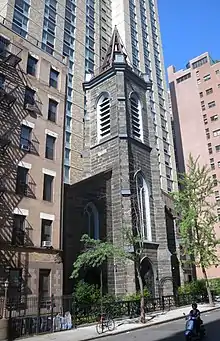 ![]() The façade and bell tower of the former St. Ann's Cathedral in Manhattan. | |