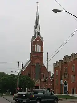 Three buildings associated with the church are located nearby. A two-story brick rectory, bought by the parish in 1925,[4] sits behind the church, while a Catholic school lies next door.[2] Across Clinton Street from the church is located a convent of the Sisters of Notre Dame, a two-story Italianate building constructed in 1862.[5]