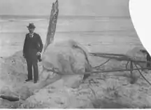 Its head was nearly destroyed, and only the stumps of two arms were visible ... The body, as it lies somewhat imbedded in the sand, is 18 feet long and about 7 feet wide, while it rises 3+1⁄2 feet above the sand ... The weight of the body and head would have been at least four or five tons. If the eight arms held the proportions usually seen in smaller species of the octopus, they would have been at least 75 to 100 feet in length and about 18 inches in diameter at the base.[9]