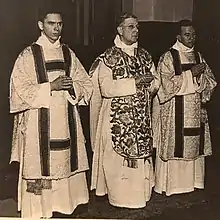 Unlike certain other Toronto parishes of the same era, such as St. Mary Magdalene's, St Thomas's, Huron Street, and St. Matthias, Bellwoods, St Bart's was not an Anglo-Catholic foundation. The first Anglo-Catholic rector of St Bartholomew's was Charles Fredrick Pashler. A veteran of the First World War, who had been severely wounded at Monchy in August 1918, Pashler was influenced not only by the Tractarian and Ritualist movements of the Church of England, but also by the simple Roman Catholic piety he had witnessed in rural France: "the kindliness and unaffected piety of the people, the natural practice of their religion, the soutane-clad figures of their pastors in the village streets and country lanes" were all to have their influence on his ministry.[11] Pashler was "unique among Toronto priests" of his generation "inasmuch as he always and everywhere wore his cassock, in and out of season" (a common practice on the Continent and in Anglo-Catholic parishes in England at the time).[12]