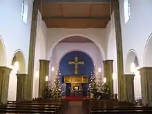 St. Bernward's Church houses several sightworthy pieces of art. The Gothic retable showing various saints and the Coronation of the Virgin dates from 1430.[5] It originally stood in Trinitatishospital, a hospital which was founded in 1230 and destroyed in 1945. There is also a remarkable statue representing Saint Bernward holding a Bernward Cross in his hand. The golden Bernward Cross which was made about 1130 is one of the most famous items in the museum of the Cathedral of Hildesheim.