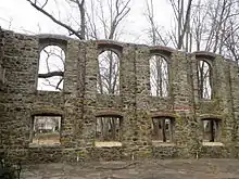 On March 16, 1911, disaster struck: the college was completely destroyed by a fire that began in the chapel cellar. None of the 200+ faculty and students were killed or injured. Sacred vessels and vestments, along with thousands of priceless manuscripts and books were lost. The burned-out shell was pulled down, and the salvageable building materials were transported to Catonsville, where the college was quickly rebuilt. All that remained were standing ruins of the 1906 Recreation Hall.[6][Note 1]