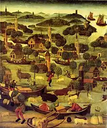 The St. Elizabeth's flood of 1421 was a flooding of the Grote Hollandse Waard, an area in what is now the Netherlands. It takes its name from the feast day of Saint Elisabeth of Hungary which was formerly 19 November. It ranks 20th on the list of worst floods in history. During the night of 18/19 November 1421 a heavy storm near the North Sea coast caused the dikes to break in a number of places and the lower-lying polder land was flooded. A number of villages were swallowed by the flood and were lost, causing between 2,000 and 10,000 casualties. The dike breaks and floods caused widespread devastation in Zeeland and Holland.